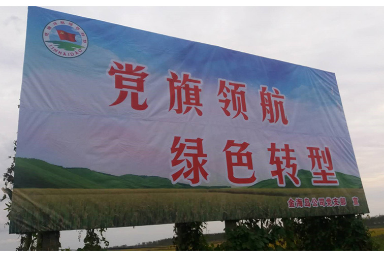 在黨建品牌設計時,公司黨支部根據公司所處國家級自然保護區區位特點、所在地區綠色轉型發展思路和自身轉型發展工作要求,確立了“黨旗領航、綠色轉型”為公司黨建品牌名稱。黨建品牌標識由黨旗、藍天、灘涂、JINHAIDAO(金海島)以及品牌名稱等元素組成。“黨旗”在“藍天”的映襯下,高高地飄揚在綠灘涂上,寓示著黨旗引領金海島公司綠色轉型;“綠灘涂”與鹽城的“綠色轉型、綠色跨越”相一致,同時“綠”代表生態、代表高質量、代表著希望;以“黨旗”為中心,寓意金海島公司圍繞中心抓黨建,抓好黨建促轉型,讓黨組織成為推動企業發展的核心,讓黨員成為推動企業發展的先鋒。
