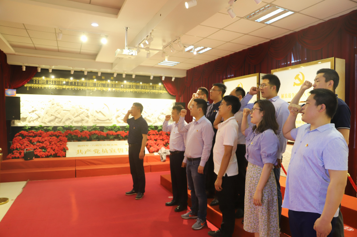 在曹書記的帶領下,黨員干部們依次參觀了會師展覽館、口述歷史室等場館,黨員干部們認真聆聽曹書記的講解,不時駐足仔細觀看展板內容和檔案文獻。在黨員宣誓室,支部書記周宏奎帶領全體黨員重溫入黨誓詞,面對鮮紅的黨旗,黨員們舉起右手莊嚴宣誓,再次感受了令人激動的入黨時刻,提醒自己不忘初心,牢記使命,履行誓言。在多功能宣教室,曹書記上了一堂生動而深刻的特別黨課。大家聆聽了新四軍在蘇中浴血奮戰的革命事跡介紹,了解到八路軍、新四軍獅子口勝利會師的偉大歷史,對老一輩無產階級革命家的革命歷程和無私奉獻精神有了更深的體會與感受。最后,支部書記周宏奎在總結講話中要求,全體黨員要繼承和發揚艱苦奮斗、勵精圖治的革命傳統,繼承和發揚同心同德、開拓創新的革命精神,創新思維、埋頭苦干、奮發有為、拿出擔當,積極投身到轉型升級高質量發展中去。