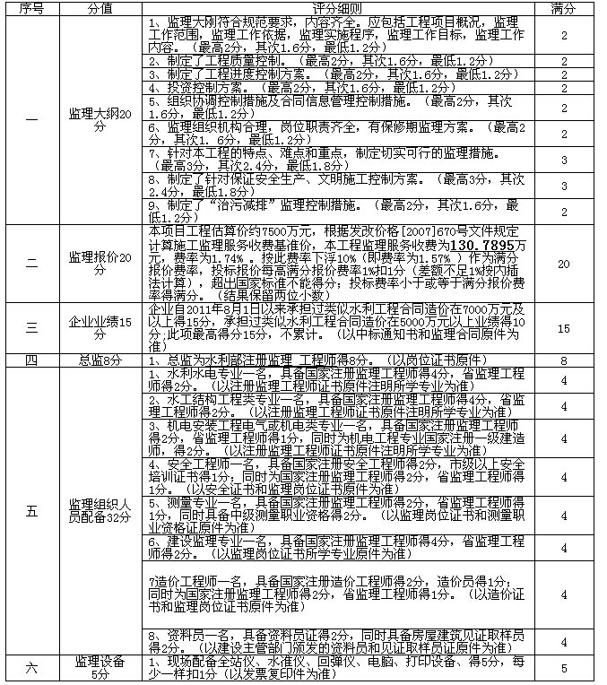 ⑤ 累計(jì)所有打分項(xiàng)以綜合得分最高者推薦為第一中標(biāo)候選人,出現(xiàn)2個(gè)或2個(gè)以上投標(biāo)人綜合得分相同時(shí)(指得分整數(shù)與小數(shù)點(diǎn)后兩位均相同),以投標(biāo)報(bào)價(jià)得分高的投標(biāo)人排序在前;如投標(biāo)報(bào)價(jià)得分仍一致時(shí),以監(jiān)理大綱得分高者排序在前。