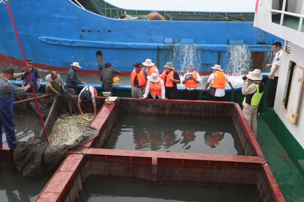 上午9時,增殖放流活動正式開始。東臺公司、東臺市海洋、公證等部門負(fù)責(zé)人、漁業(yè)技術(shù)專家及漁民代表乘坐漁政船從如東洋口港出發(fā),前往東臺市145漁區(qū)。省海洋漁業(yè)指揮部、東臺市漁業(yè)技術(shù)站的專家對苗種品種、規(guī)格、數(shù)量及質(zhì)量等指標(biāo)進(jìn)行現(xiàn)場檢查,嚴(yán)格把關(guān),保障放流苗種質(zhì)量安全。隨后,工作人員將688.636萬尾大黃魚和大黃魚標(biāo)志魚苗種投放大海,苗種金額達(dá)330萬元,剩余價值470萬元的苗種,包括半滑舌鰨、黑鯛、菊黃東方鲀、文蛤、大竹蟶等將根據(jù)天氣、潮汐等具體情況于七月底前放流完畢。省沿海開發(fā)集團(tuán)為確保今年增殖放流活動的順利進(jìn)行,事先對放流工作進(jìn)行了周密安排,活動細(xì)化到船只、人員、工具等各個環(huán)節(jié),逐項(xiàng)落實(shí)到位。