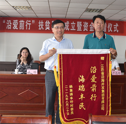 9月5日上午,鄧東升一行參加了“沿愛前行”扶貧基金成立暨資金捐贈儀式。鄧東升代表省沿海開發(fā)集團(tuán)向封圩村捐贈150萬元成立扶貧濟(jì)困慈善基金,該基金將長久續(xù)存并持續(xù)產(chǎn)生穩(wěn)定收益,基金權(quán)益及投資收益全部歸屬封圩村,專項用于幫扶封圩村失學(xué)兒童、孤寡老人、殘疾人、因病因災(zāi)返貧等生活困難的低收入家庭。封圩村向沿海集團(tuán)贈送了“沿愛前行、海瑞豐民”錦旗。鄧東升在講話中指出,作為省屬企業(yè)和省“五方掛鉤”成員單位,省沿海開發(fā)集團(tuán)積極貫徹省委省政府“全力打好江蘇精準(zhǔn)脫貧攻堅戰(zhàn)”的總體要求,聚焦“兩不愁三保障”目標(biāo),探索建立扶貧長效機制,真扶貧、扶真貧;鎮(zhèn)村要嚴(yán)格執(zhí)行基金管理辦法,將每一分錢都花在刀刃上,扶貧濟(jì)困、慈善助學(xué),做到真脫貧、脫真貧,讓封圩村的低收入群體和弱勢群體有更多的參與感、獲得感和幸福感;沿海集團(tuán)將以此次成立扶貧基金為契機,既“輸血”又“造血”,繼續(xù)加大幫扶力度,鞏固拓展脫貧成果。