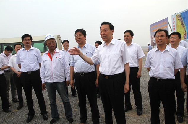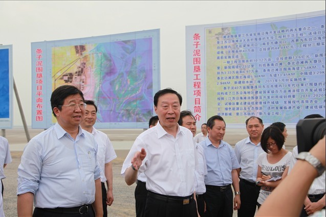 6月29日下午,省委書記羅志軍率省有關廳局和鹽城市、東臺市的主要負責人,專程來到條子泥匡圍一期工程現場進行調研,集團公司董事長、黨委書記梁學忠等陪同調研。