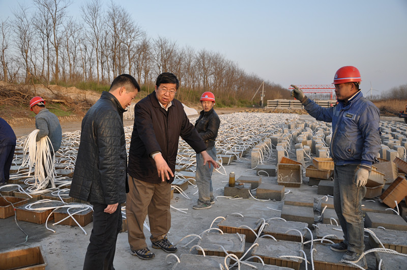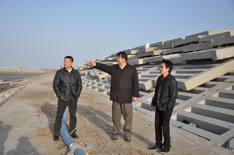 在北海堤堤腳,梁董事長一邊沿著沖刷段實地查看沖刷及臨時防護情況,一邊向項目負責人仔細詢問近期潮流變化及對堤身的影響。他強調,近幾年沿海地區因港槽擺動及防護工程措施不到位造成的圍堤垮塌事故時有發生,作為省百萬畝灘涂開發的重點工程,我們不能抱有任何幻想,更不能麻痹大意,必須始終保持高度警惕。要高度重視北海堤防護實施的風險和難點,充分考慮將要遇到的困難和問題,投入足夠的設計和施工力量,準備充足的物資和人力,從防護措施、工程質量、施工工藝等各個方面都達到一流目標,確保防護工程的順利實施和防護作用的有效發揮,把北海堤工程建設成為百年工程。