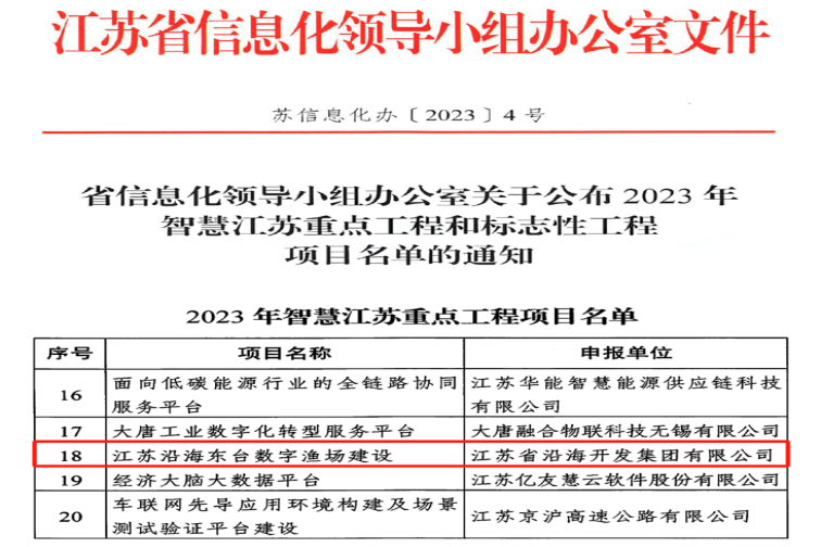 近日,江蘇省信息化領導小組辦公室公布了2023年智慧江蘇重點工程項目名單,江蘇省沿海開發集團有限公司的“江蘇沿海東臺數字漁場建設”項目經過初審推薦、形式審查、專家評審、綜合會審等環節成功入選,成為省級數字化示范工程的重要一員。