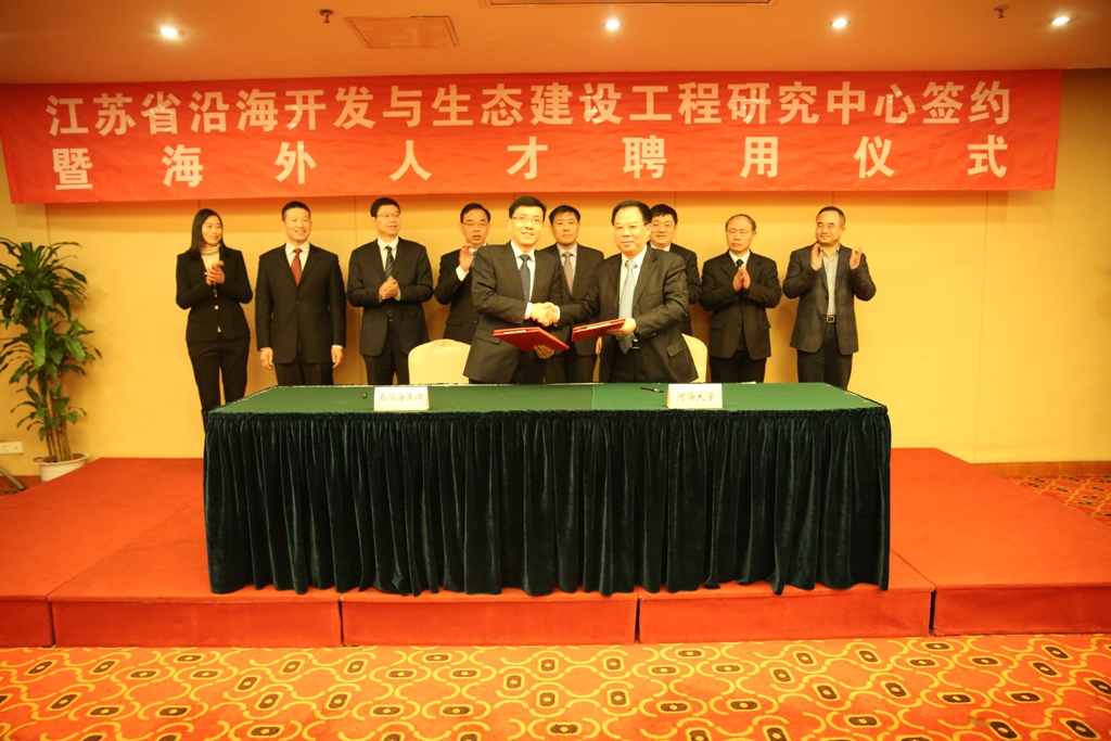 12月17日上午,集團(tuán)公司與河海大學(xué)聯(lián)合舉行了江蘇省沿海開(kāi)發(fā)與生態(tài)建設(shè)工程研究中心簽約暨海外人才聘用儀式。省委組織部干部四處處長(zhǎng)董德,河海大學(xué)校長(zhǎng)徐輝、副校長(zhǎng)唐洪武、海外專家代表李凌,集團(tuán)董事長(zhǎng)鄧東升、總經(jīng)理丁建奇、副總經(jīng)理唐正東,黨委委員、東臺(tái)公司總經(jīng)理周金陽(yáng)以及省國(guó)資委監(jiān)事席寧等出席儀式。儀式由丁建奇總經(jīng)理主持。