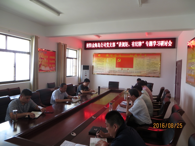 8月25日下午,金海島公司黨支部在辦公樓一樓會議室舉行了“講規矩,有紀律”專題學習研討會,支部書記薛太華同志主持了會議。會議首先組織大家集體學習了《中國共產黨章程(總則)》以及《習近平總書記系列重要講話讀本(實干才能夢想成真)》,之后,由陸中陽同志、王成同志以及王東同志就其最近的兩學一做學習情況,發表自己對“講規矩,有紀律”的感想。