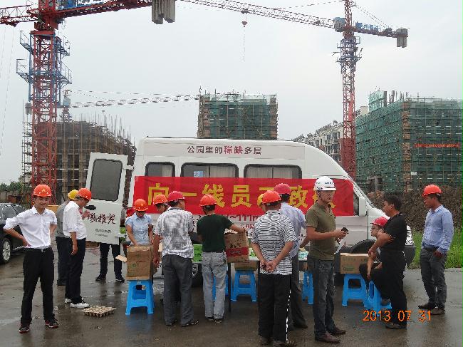 入夏以來,興化地區持續高溫。為加強安全生產,做好防暑降溫工作,7月31日,佳豪房地產開發公司領導來到天水華庭風雅苑施工現場,慰問高溫期間堅守在施工一線的南通五建建設工程有限公司的員工,公司領導對一線員工堅守崗位,繼續保持高昂的工作熱情表示真摯的感謝和親切的問候,并為他們送去防暑降溫慰問品,切實保障員工的身體健康,在盛夏酷暑之際給一線施工人員帶來了清涼