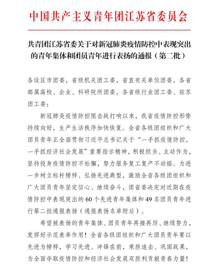 3月11日,團(tuán)省委下發(fā)文件《共青團(tuán)江蘇省委關(guān)于對新冠肺炎疫情防控中表現(xiàn)突出的青年集體和個人進(jìn)行表揚的通報(第二批)》,省沿海集團(tuán)凌洋公司新冠疫情防控青年突擊隊獲團(tuán)省委通報表揚。