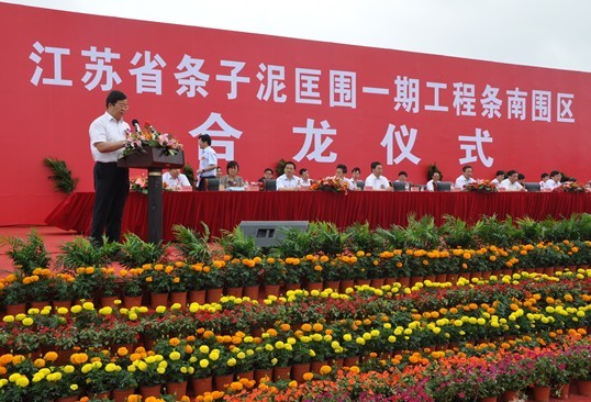 6月26日上午,條子泥匡圍一期工程條南圍區合龍儀式在工程施工現場隆重舉行。省政府副秘書長徐立,省發改委、沿海辦、財政廳、國土資源廳、環保廳、水利廳、審計廳、國資委、海洋漁業局、農業資源開發局、能源局、交通運輸廳港口局、電力公司等省有關部門負責同志,鹽城市、東臺市主要領導同志出席合龍儀式。