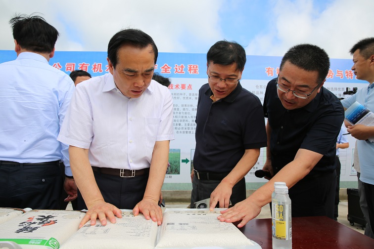 倉東公司有機水稻種植示范區土地廣袤平整,秧苗泛著青綠隨風輕擺,一派和諧美麗的田園景象。這里的水稻全程使用有機肥料,設置生物隔離帶,采取人工除草,利用誘蟲燈等設備進行大面積誘殺病蟲害等措施確保水稻種植品質,經過兩年的土壤改良,氮磷、有機質達到二級,鉀達到一級。王榮平關心有機水稻的種植過程與銷售,他指出,有機農產品有著廣闊的前景,要嚴格按照有機種植標準,發揮土地資源優勢,實現社會效益和經濟效益雙提升。