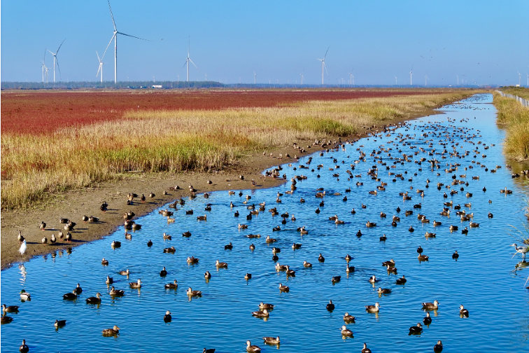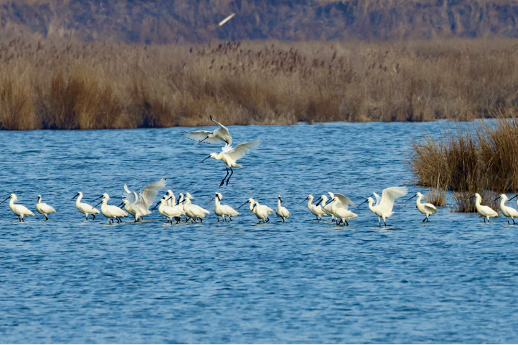 群鳥翩躚,蔚為壯觀。藍天碧水間,鳥鳴聲此起彼伏,構成了一幅人與自然和諧相處的生態畫卷。