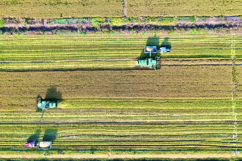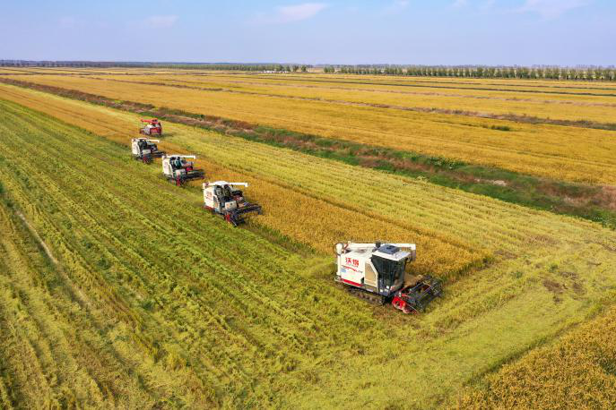 喜看稻菽千重浪,土地流金萬年豐。秋風再起,拂起滿地斑斕的豐收色彩,稻谷飄香,又是一年豐收時節(jié)。江蘇省沿海開發(fā)集團農(nóng)發(fā)射陽分公司的現(xiàn)代農(nóng)業(yè)生產(chǎn)示范基地,多臺收割機一路“高歌猛進”,濃厚的秋意匯聚在每一粒飽滿的稻谷里,順著卸糧桶涌進了每個人的心里。秋收進行時,走進射陽,赴一場豐收之約。