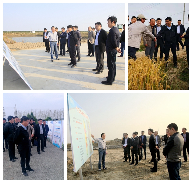 鄧東升董事長一行先后深入條子泥生態公園、養殖管理中心、條北土壤改良項目和金海島蘇米研究院育種基地、超日標水稻基地、“一稻三蝦”種養基地調研察看。每到一地,鄧東升一行認真察看現場,聽取項目介紹,了解項目規劃、種植品種、技術成本、生產體系、管理模式、“三品”認證、銷售渠道等情況,就轉型升級過程中的困難問題和相關事項進行探討交流。