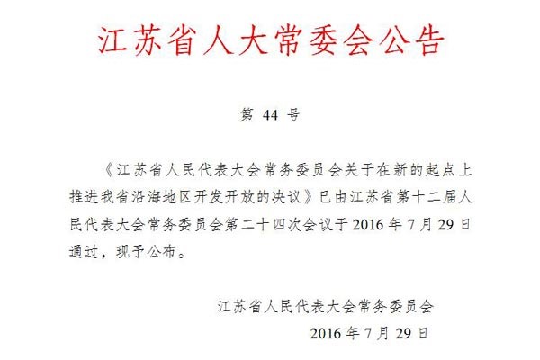 為深入貫徹中共江蘇省委決策部署,更好抓住國家實施“一帶一路”和長江經濟帶建設等重大戰略機遇,在新的起點上推進江蘇沿海地區開發開放,特作如下決議: