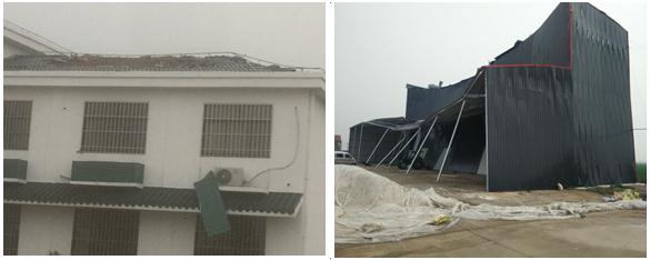 2017年7月15日凌晨1時(shí)許,射陽金海島公司突遭龍卷風(fēng)和暴雨襲擊,最大風(fēng)力達(dá)12級(jí),雨量達(dá)160mm。受災(zāi)區(qū)位于公司場(chǎng)部、雙洋片、千秋片和金港片,其辦公和生產(chǎn)生活用房、用電線路設(shè)備、糧食烘干設(shè)施、防風(fēng)林樹木和田間作物均不同程度受損。據(jù)初步統(tǒng)計(jì),受損房屋89間、電力線路250米、電桿2根、80KVA變壓器1臺(tái)、樹木165株、室外電子顯示屏1座及辦公樓生活水箱等。災(zāi)害導(dǎo)致公司境內(nèi)10多戶居民生活斷電、400多畝魚塘無電增氧投餌、3公里道路交通受阻、14000畝農(nóng)作物受漬、300畝農(nóng)作物沉澇,直接經(jīng)濟(jì)損失達(dá)40多萬元,所幸沒有發(fā)生人員傷亡。