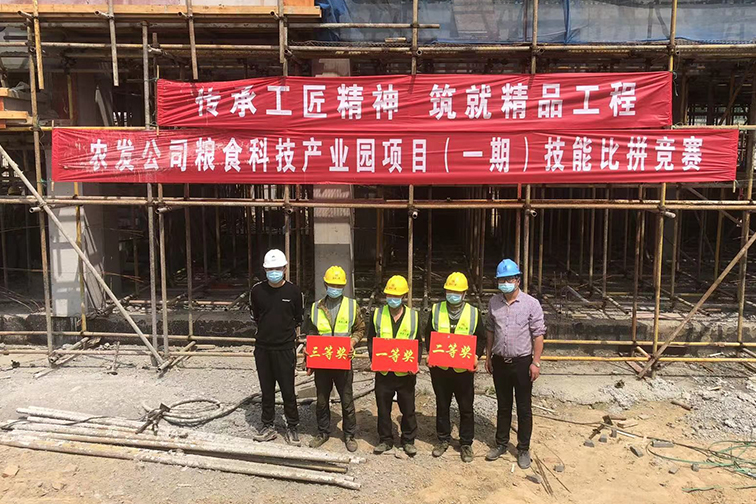 4月24日,在農發公司糧食科技產業園項目(一期)現場,建管中心黨支部聯合施工及參建單位舉辦了以“傳承工匠精神 筑就精品工程”為主題的崗位練兵比賽,來自參建單位的近30名技術精英在封閉化管理的項目施工現場過招,用超強實力,展示工程質量。